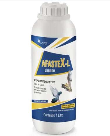 Descrição: O Afastex Líquido 1L é um repelente olfativo natural à base de óleo de canela, eficaz para afastar pombos e morcegos sem matá-los. O produto exala lentamente um odor desagradável de canela que desalojará esses animais dos seus locais de abrigo e alimentação, obrigando-os a procurar outros lugares para se alojarem. Indicado para uso em ambientes internos e externos, como telhados, forros de casas, galpões e instalações rurais, o Afastex Líquido oferece uma solução natural e eficiente para o controle de pombos e morcegos.